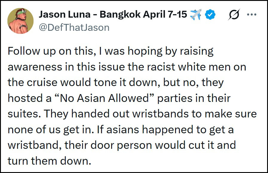 Jason Luna, one of the most well-known male Asian stars in gay porn, was on the same cruise and took exception to the post, calling it out right away. Going to X to write.